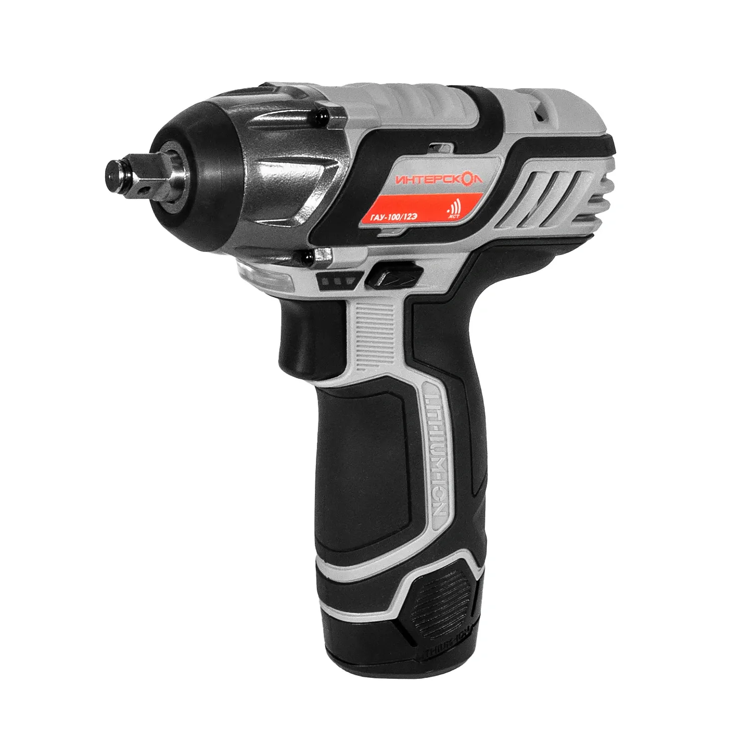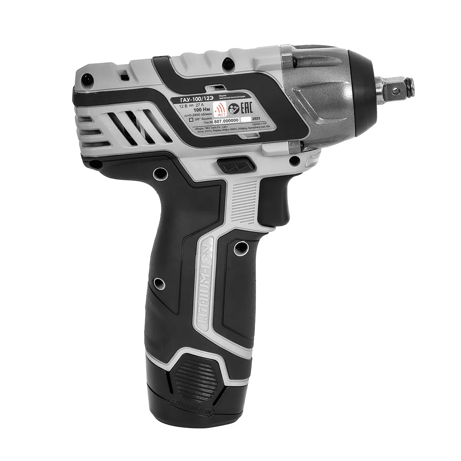 Ударный гайковерт ГАУ-100/12Э относится к классу безреактивного инструмента. Всем хорошо известен так называемый «русский ключ» - зубило и молоток – самую сильно затянутую/прикипевшую гайку можно отвернуть, уперев в нее зубило и нанося по ней удары молотком. При этом ударный импульс воздействует вдоль поверхности вращения оснастки, практически перпендикулярно диаметру. Точно так же работает ударный гайковерт, только он не портит оснастку за счет равномерного приложения силы ударов по всей поверхности шлица/головки/гайки через ударную биту/торцевую головку. Вращающий момент образуется за счет соударения на каждом обороте в ударной муфте частей редуктора, называемых молот и наковальня. За счет разницы масс самого инструмента и закручиваемой оснастки, которая обычно достигает 100 и более раз и возникает эффект, когда крупный крепеж можно завернуть или отвернуть, всего лишь слегка придерживая инструмент. Сила затяжки регулируется за счет выбора скорости вращения (и частоты ударов) и ограничения длительности воздействия (количества ударов).