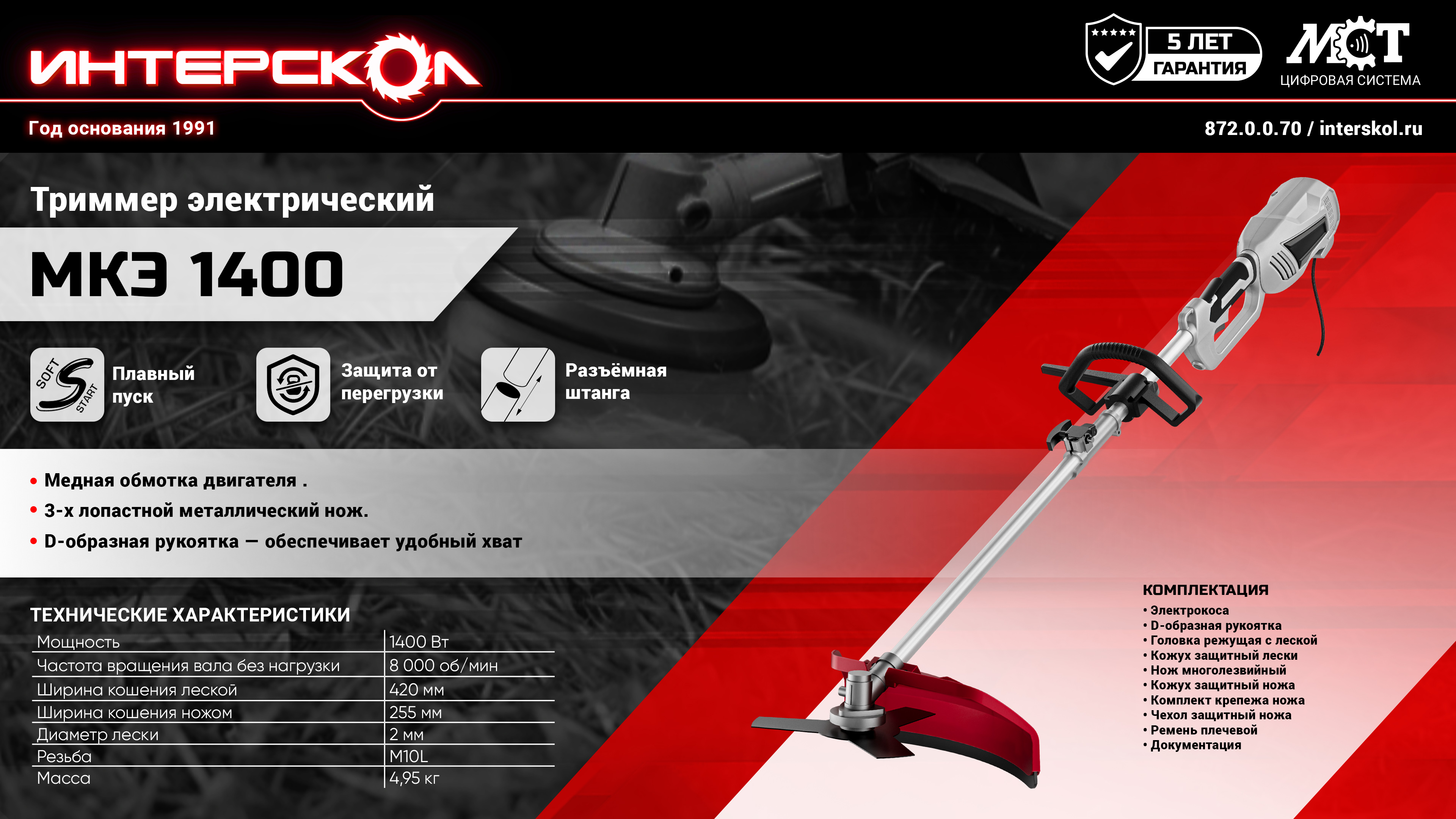 Номинальная потребляемая мощность электрического триммера МКЭ 1400 составляет 1400 Вт. Это позволяет ему легко справляться с жесткими стеблями травы, мелким и средним кустарником (при установке входящего в комплект трехлопастного ножа). С другой стороны, такая нагрузка на электросеть не является достаточно высокой, чтобы вызывать какие-либо затруднения при эксплуатации устройства. Наличие плавного пуска и защиты от перегрузки служат дополнительной гарантией как безопасности питающей электросети, так и стабильной работы кустореза.