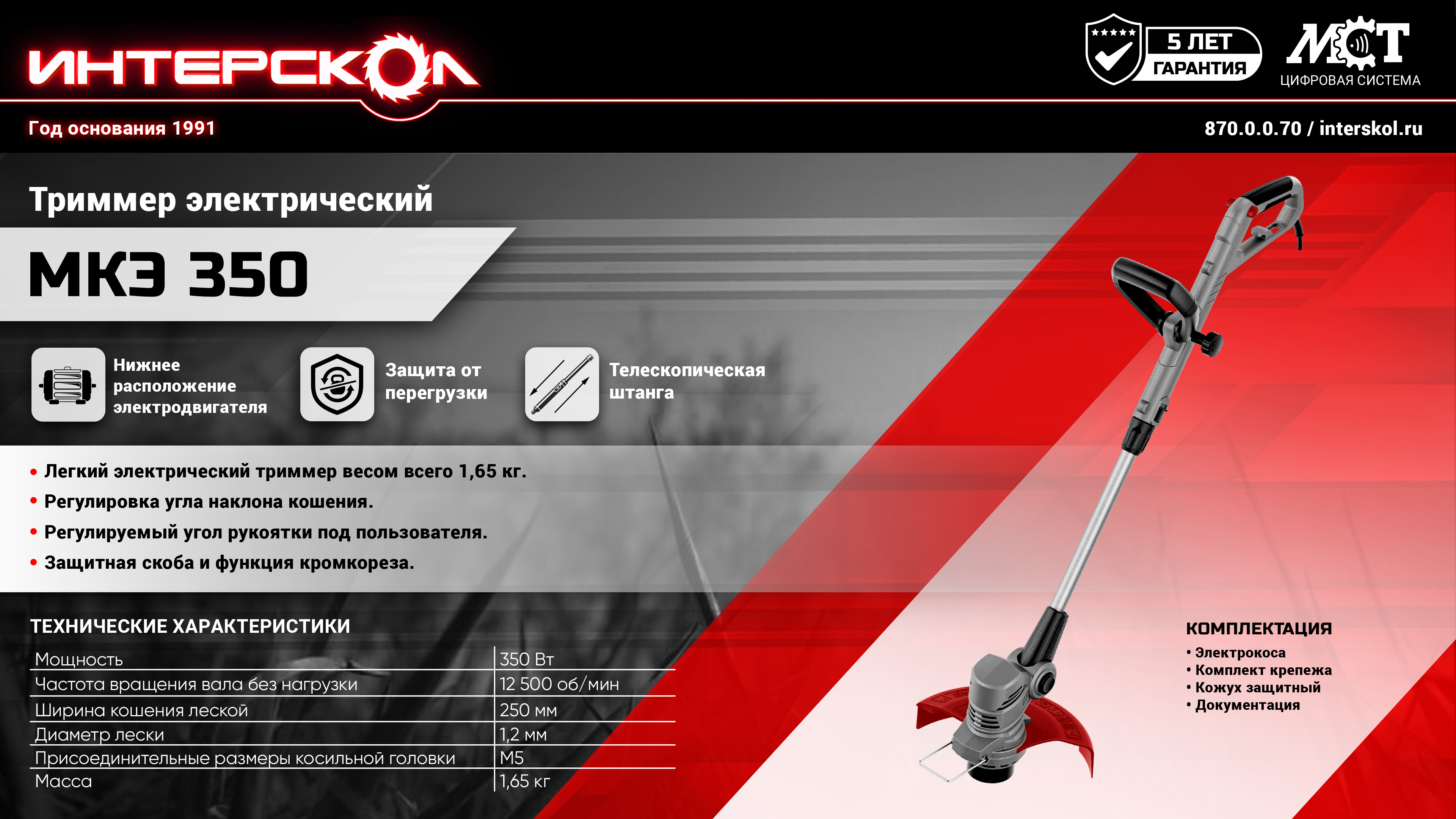 Электрические мотокосы ИНТЕРСКОЛ предназначены для скашивания и подравнивания травы возле цветочных клумб, заборов и прочих садовых построек, а также в труднодоступных для колесных газонокосилок местах. Подобную технику обычно применяют там, где использование бензиновых аналогов нежелательно, невозможно по соображениям безопасности, либо же в тех случаях, когда владелец просто предпочитает работать электрическими моделями – легкими, относительно тихими и простыми в эксплуатации.